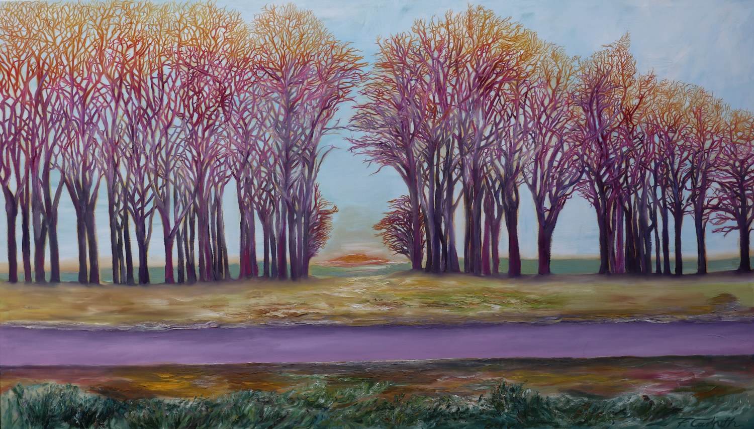 The work “Bach” has a coloring and composition that allows the gaze to wander through the picture and the overlying layers of paint become more and more impasto. Light and shadow blur here in reflections that give an atmospheric lighting mood. Foliage and trees form a frame that leads the perspective to a vanishing point. If you look at the work from a distance or up close, only the original effect appears.