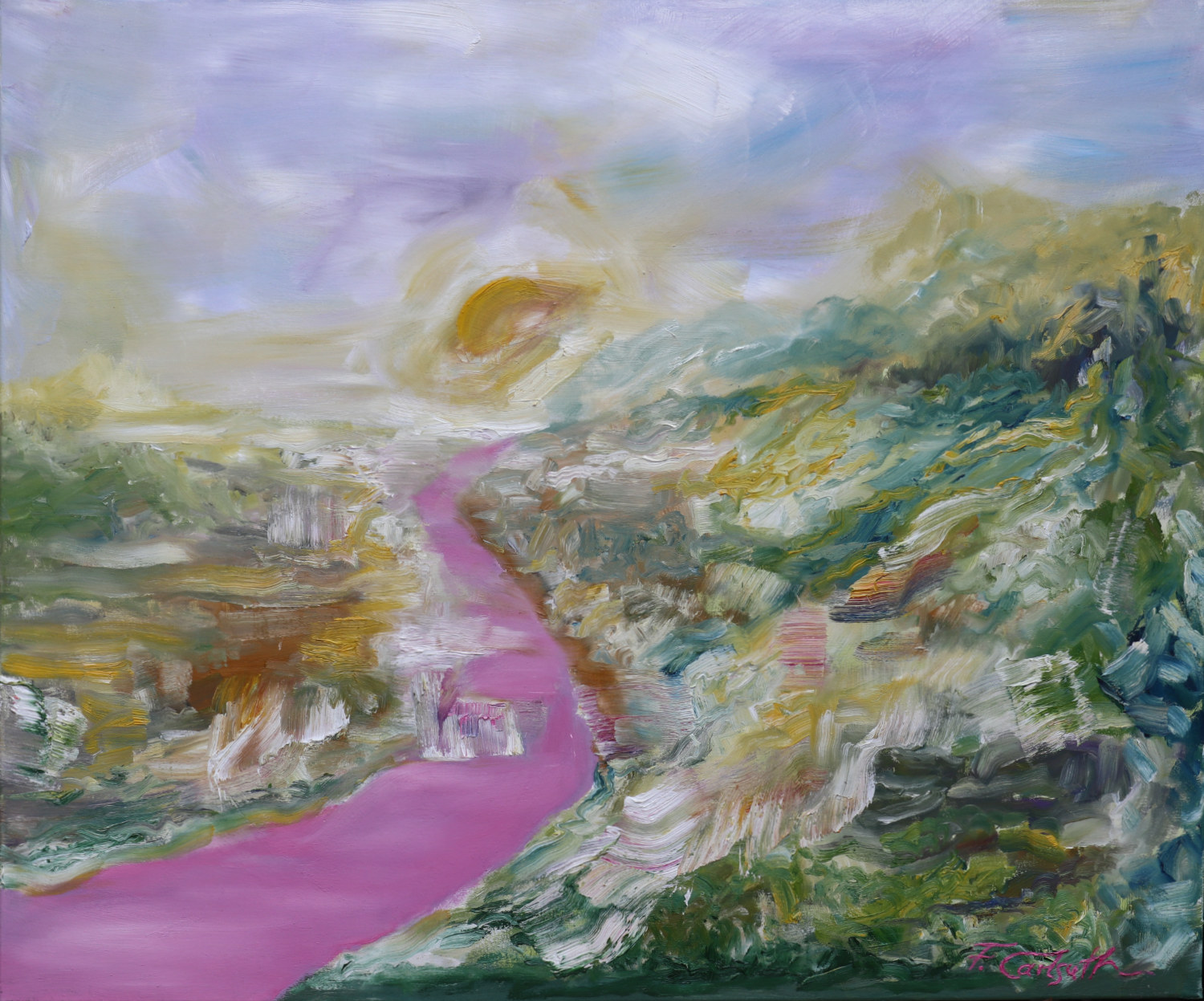 Der rosa Weg zieht sich diagonisch von unten links nach oben rechts in die Bildtiefe. Um ihn herum flackern Akzente von Lichtreflexen die der Landschaft eine leuchtende, fast pulsierende Qualität verleiht.